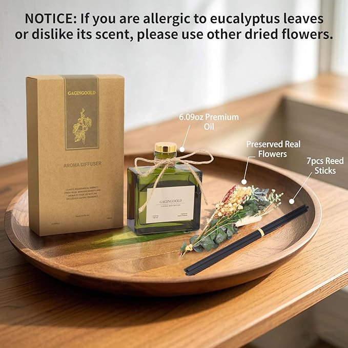 - Modern Design: The contemporary green glass bottle and natural reeds complement any home or office decor. Our premium reed diffuser set includes real dried flowers, 6.09 oz ( 180 ml ) non-toxic fragrance liquid, 7 reed diffuser sticks, a recyclable glass vessel, and a stylish gift box.You can enjoy the fun of DIY.