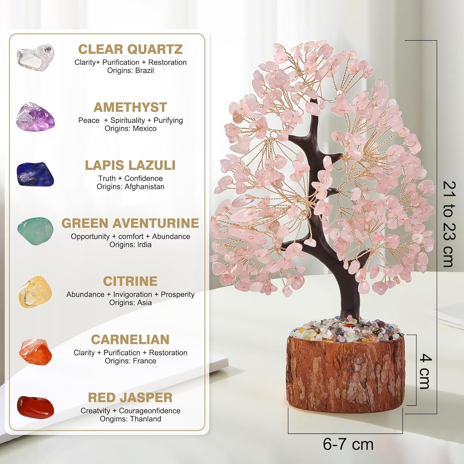 - Pink Crystal Tree: This handmade 8-10 inch pink rose crystal decoration can serve as a beautiful and meaningful addition to any home or office space. It adds a touch of natural beauty and good vitality to any room in your home. Place it in a prominent and easily accessible location, such as a living room, bedroom, office, or meditation area.