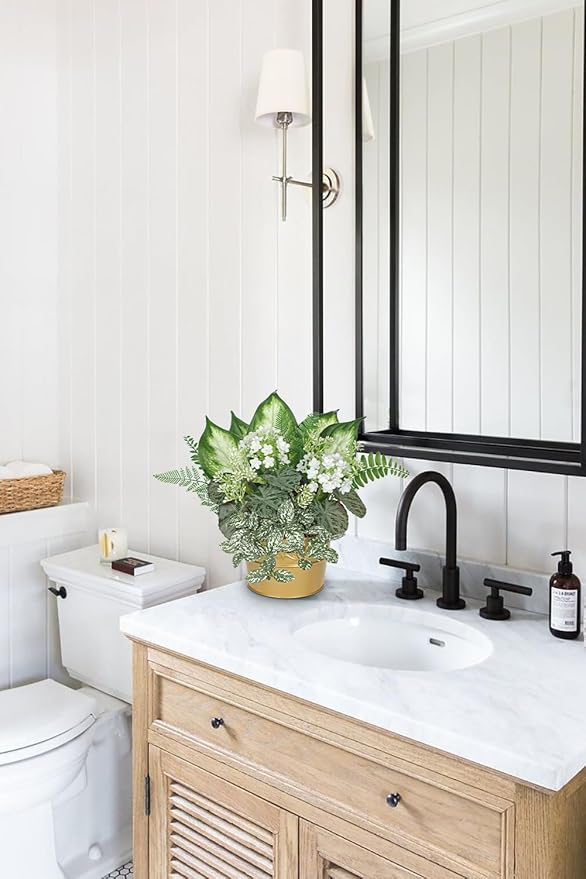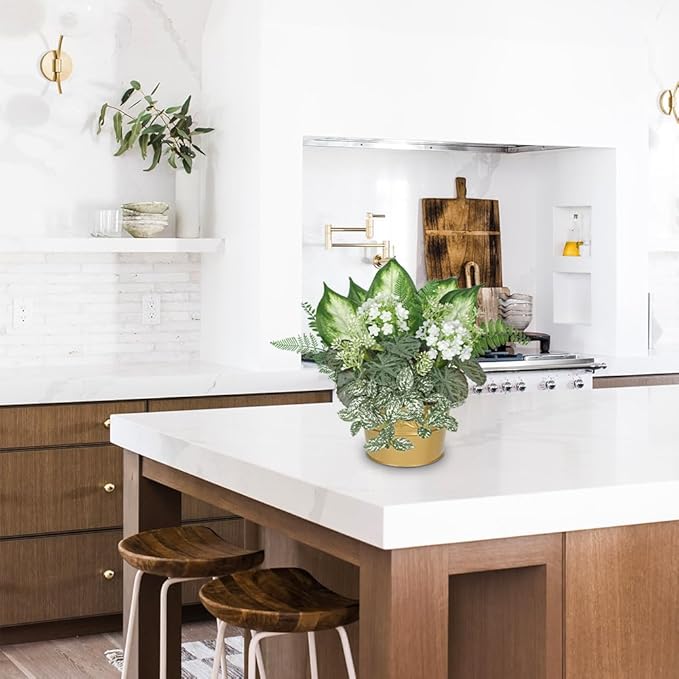 - [Fake Potted Plants] -Evergreen plants, peperomia, ferns, small flowers, fittonia albivenis, 7 mixed small fake plants in a golden round pot that is 4.7"(L) x 4.7"(W) x 3.9"(H). The overall height of the fake plant decor and pot is 11.8" tall. This stunning garden arrangement showcases a variety of lifelike fake house plants