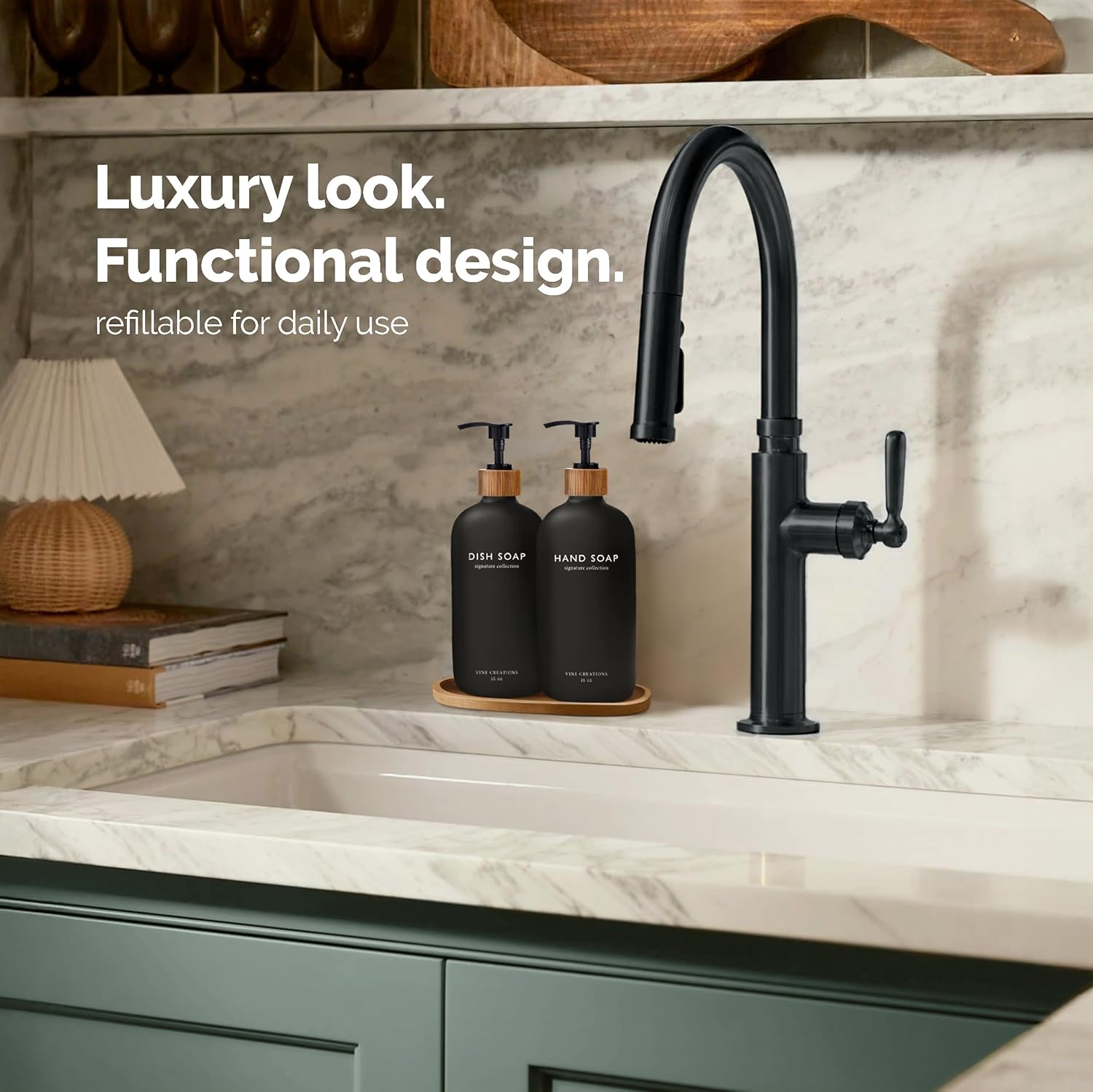 - STYLE YOU CAN FEEL – Heavier than standard dispensers, this black hand and dish soap dispenser set of 2 brings substance and sophistication to your countertop. Built to last and made to impress—with a matching bamboo tray that keeps your set tidy, stylish, and perfectly organized.