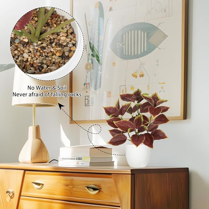 - Small Artificial Plants in Pots - Measuring 14.2" tall, compact enough for narrow kitchen counters, nightstands, or as a desk decor piece without overwhelming tight spaces. Nestled in a sleek, matte plastic pot, its roots are covered in natural stones to decorate the indoor plants in the pot, built-in cement bed to add weight to the pot so your small plant stand steadily, this plastic plants combines minimalist elegance with functionality