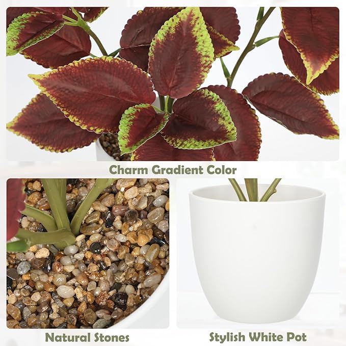 - Artificial Plants Indoor with Pot - Featuring bold magenta centers dramatically edged with lime green rims across all leaves. Each perilla leaf showcases naturalistic serrated edges and realistic embossing—capturing live plant complexity while maintaining consistent vibrancy season after season.The neutral pot pairs beautifully with ceramics, wood tones, and linen textiles, which complements both modern and rustic decors seamlessly