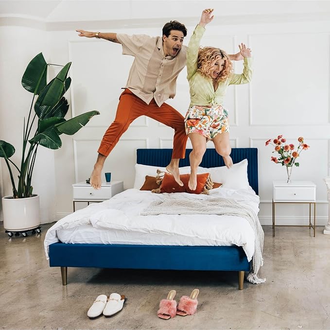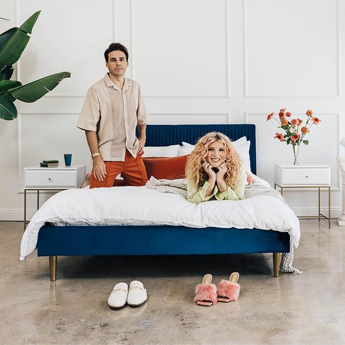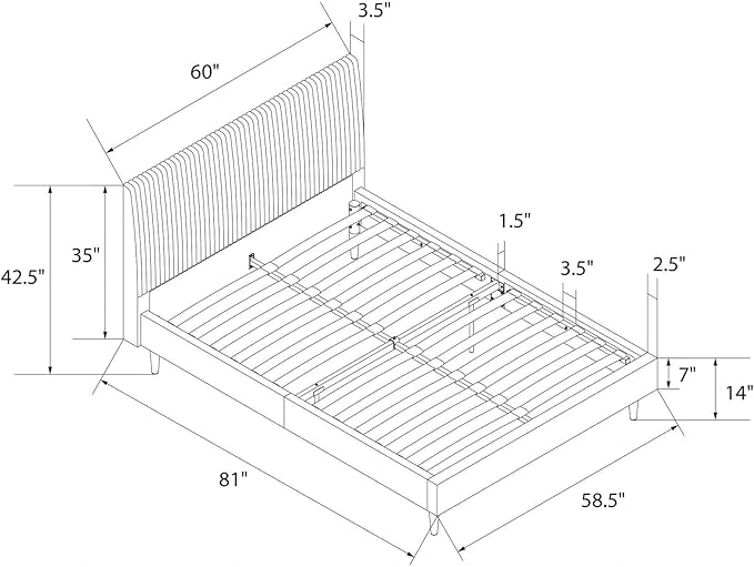 - MODERN PLATFORM BED FRAME: Mid-century modern design meets vintage luxury to create a posh bedroom piece. Designed with a tight channel tufted headboard and brass tone tapered metal legs. Full: 60"W x 81"D x 42.5"H. Max weight limit: 800 lbs.