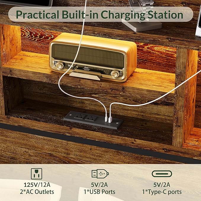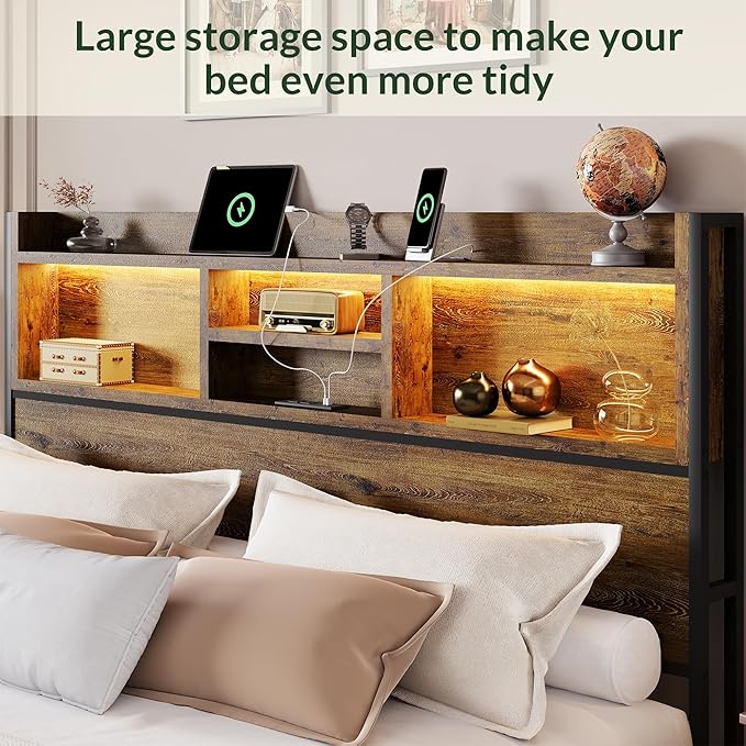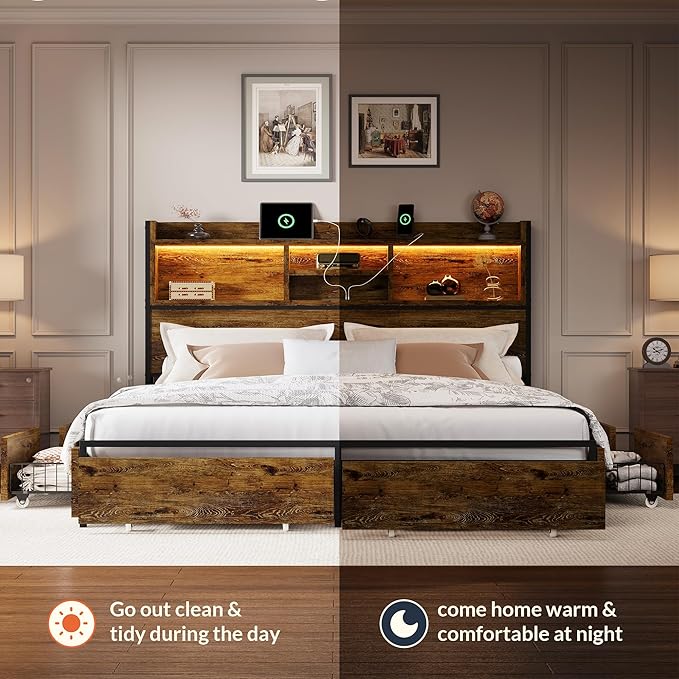 LARMACE Queen Size Bed Frame with 6 Storage Drawers and Headboard Wooden Platform Bed Frame with LED Lights and Charging Station Easy Assembly/No Box Spring Needed/Vintage Brown