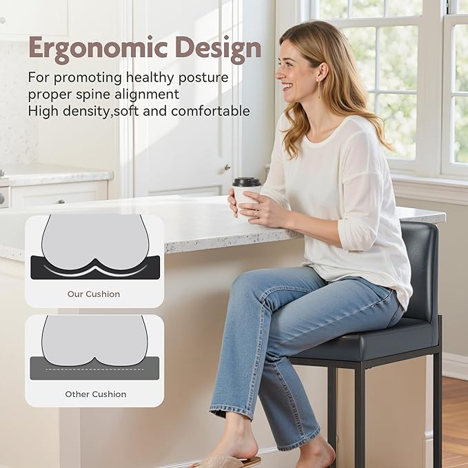 - [Upholstered PU Leather Seat]: The kitchen counter stools feature a retro matte leather surface that efficiently prevents water and stains, making cleaning easy. The 3.54" thick upholstered seat design with a soft backrest ensures a cozy seating experience. Upgrade your dining area now use our stylish counter height bar stools!