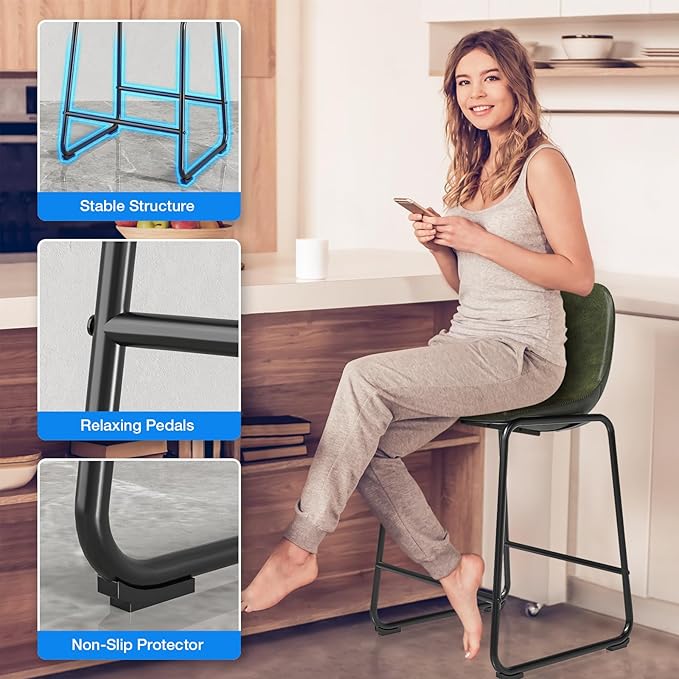 Rfiver Pu Faux Leather Bar Stools Set of 2, Industrial Pub Barstools with Back and Footrest, Modern Armless Bar Height Stool Chairs (Green, 24" Counter Chair x2)