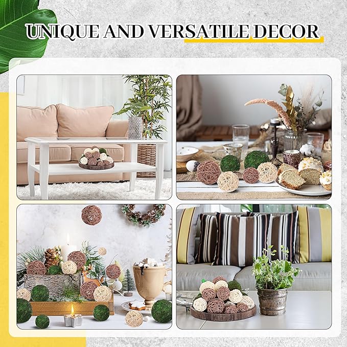 - Appropriate Size: the rattan decorative balls measure approx. 3.15 inches/8 cm and approx. 2.36 inches/6 cm in diameter; 2 pieces of the moss balls are approx. 3.94 inches/10 cm and 4 pieces are approx. 3.15 inches/8 cm, appropriate sizes make them easy to use, either as separate decorations in vases, or in combination with other ornaments