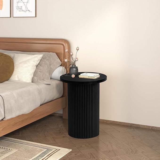 Modern Side Table, 16.93" Fluted Round Pedestal Table for Living Room, Bedroom, Entryway, Sofa, Chair – Black Accent Table with Solid Wood Strips End Table, Fully Assembled Drum Table