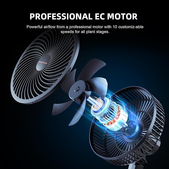 - POWERFUL VENTILATION SYSTEM: Quiet and low noise (32 dB) 6” Inline fan 402 CFM airflow with RC412 activated carbon filter and flexible duct. Provides excellent air circulation and eliminates odors. Clip fan delivers airflow ranging from 0 to 2500 RPM, flexible rotation quick circulation cooling, and customizable 10 speeds for all plant growth stages