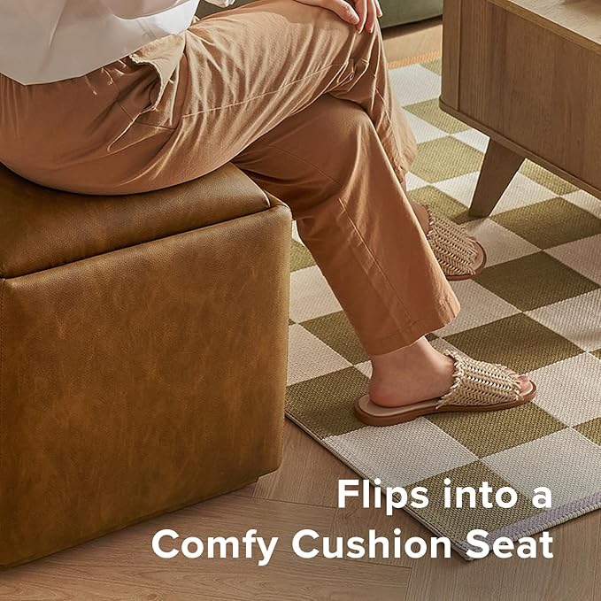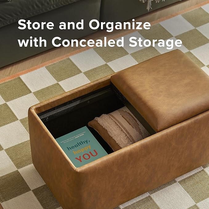 mopio Levi Storage Bench with Reversible Tray, Modern Storage Coffee Table, Bedroom Bench, Rectangular Cube Upholstered Coffee Table Ottoman for Living Room, Bedroom (Faux Leather, Pecan Brown)