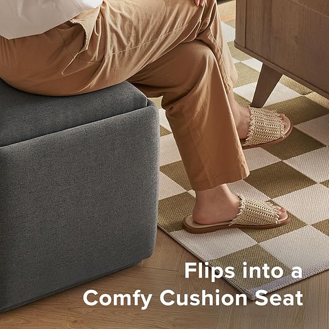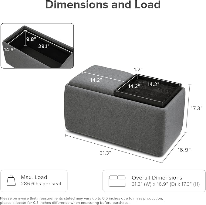 mopio Levi Storage Bench with Reversible Tray, Modern Storage Coffee Table, Bedroom Bench, Rectangular Cube Upholstered Coffee Table Ottoman for Living Room, Bedroom, Entryway (Fabric, Dark Gray)