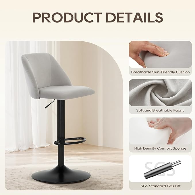 - Durable, Stylish & Comfortable Seating: Built on a sturdy 17.72" diameter base that supports up to 250 lbs, these modern bar chairs offer exceptional stability and durability without sacrificing style. The breathable upholstery, paired with high-density sponge foam padding, ensures long-lasting comfort and a refined look—perfect for both high-traffic spaces and elegant home settings.
