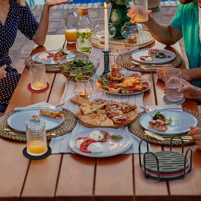 - COMPLETE SET: 8 colors, 3 different combination sets for you to choose.Each set includes 6 silicone drink coasters and a stylish metal holder, perfect for organizing and displaying on any table surface