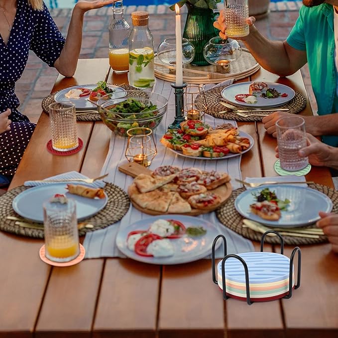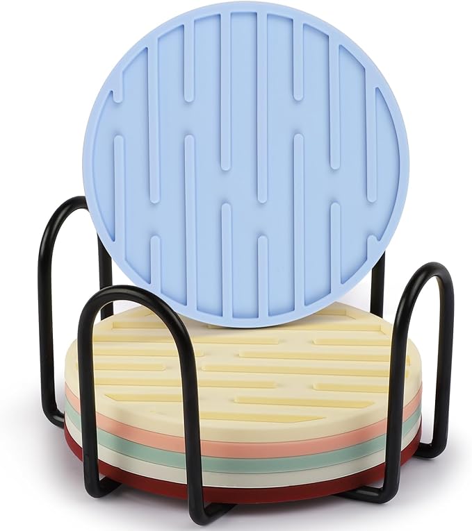 - COMPLETE SET: 8 colors, 3 different combination sets for you to choose.Each set includes 6 silicone drink coasters and a stylish metal holder, perfect for organizing and displaying on any table surface