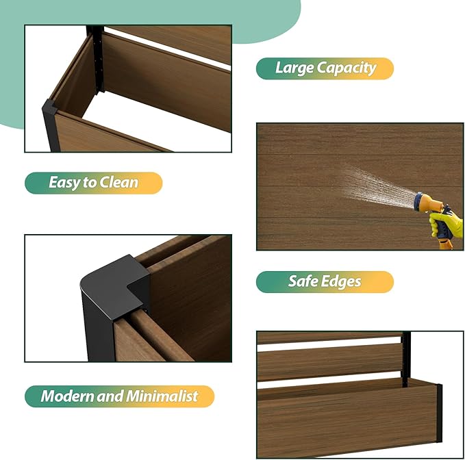 - Durable & Weather-Resistant: Built with weather-resistant composite wood and high-quality aluminum, this planter bed is designed to withstand hot summers, cold winters, and everything in between, ensuring long-lasting beauty and functionality.