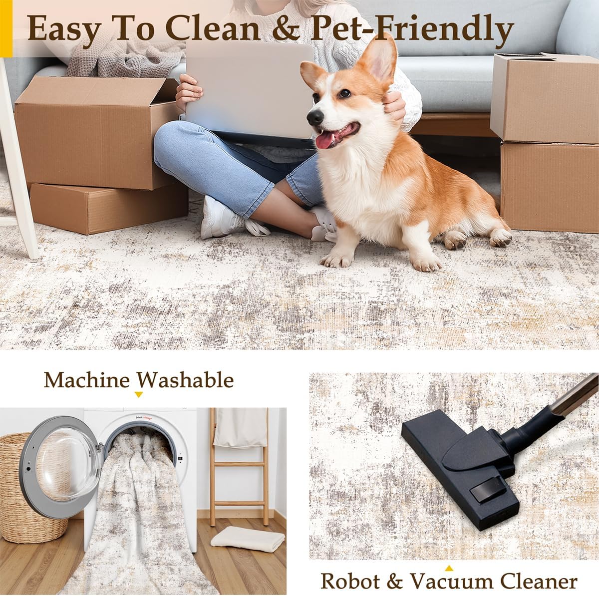 12x15 Washable Area Rug Beige Grey Neutral Abstract Living Room Bedroom Large Throw Rug Non Slip Soft Low Pile Indoor Floor Carpet for Dining Room Kitchen Office Entryway