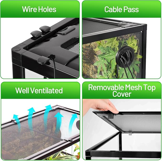 - 【Top Screen Ventilation】The removable wire top screen provides plenty of ventilation for optimum airflow, and allows full spectrum, UVB and IR light penetration. It also has pre-drilled wire entry holes for easy organization of wires and tubes.