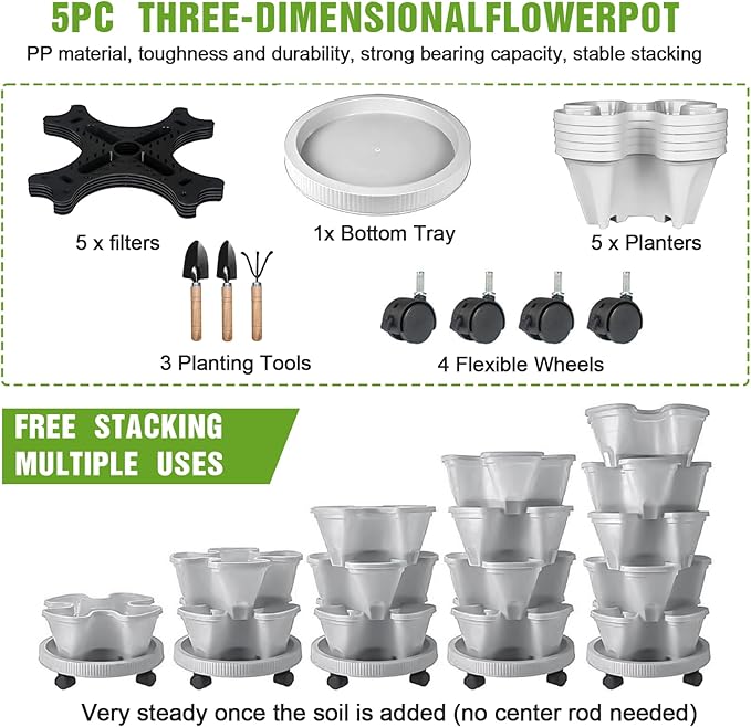 Vertical Strawberry Planter 5 Tier Stackable Tower Herb Planters-Stacking Garden Outdoor Planter Pot with Tools Mover for Succulents, Vegetables and Flowers