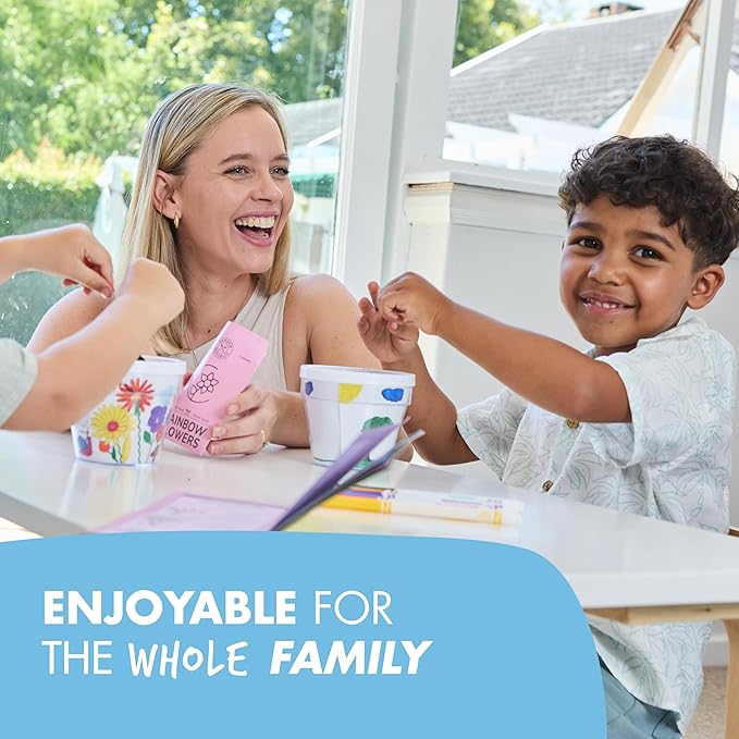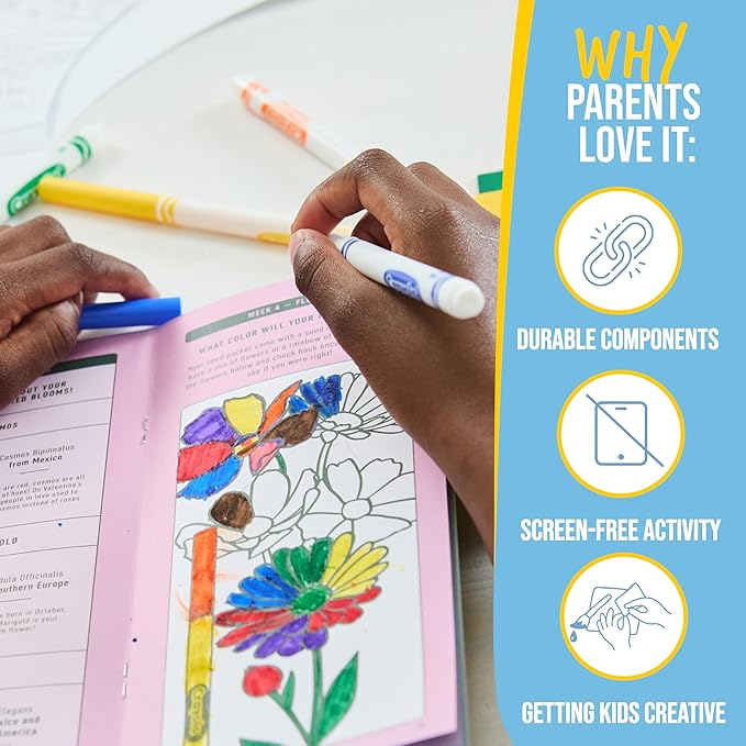 - Includes two planters, interactive growing guide, 8-pack of Crayola markers, rainbow flowers seeds, 2 soil disks, and watering bottle.