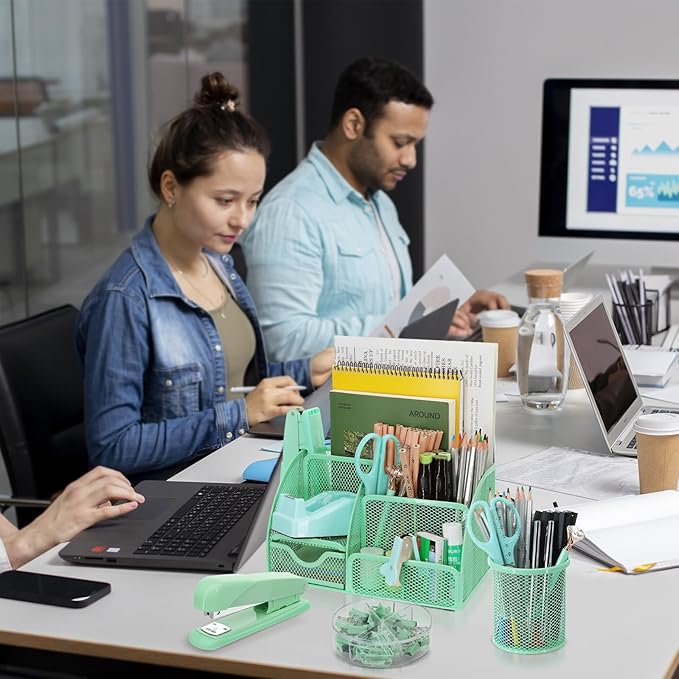 17 in 1 Green Desk Organizers and Accessories Set, 3 Office Desk Supplies Storage Organization, 4 Pens, Stapler, Staples & Remover, Tape & Dispenser, Scissors, Ruler, Clips, Hole Punch, Back to School