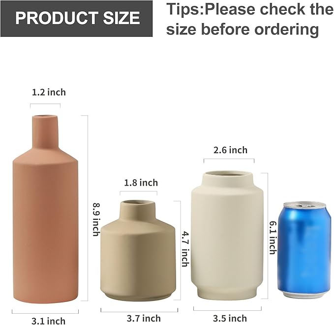 - 【Size of 3-piece Ceramic Vase Set】The ceramic flower vase set of 3 includes three different sizes: 3.15" W x 8.9" H, 3.5" W x 6.1" H, and 3.7" W x 4.9" H.