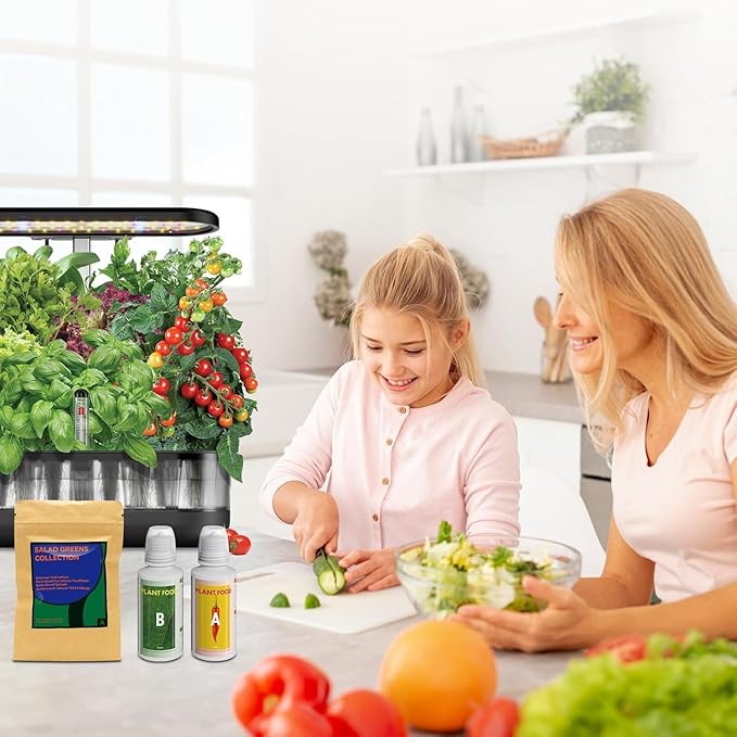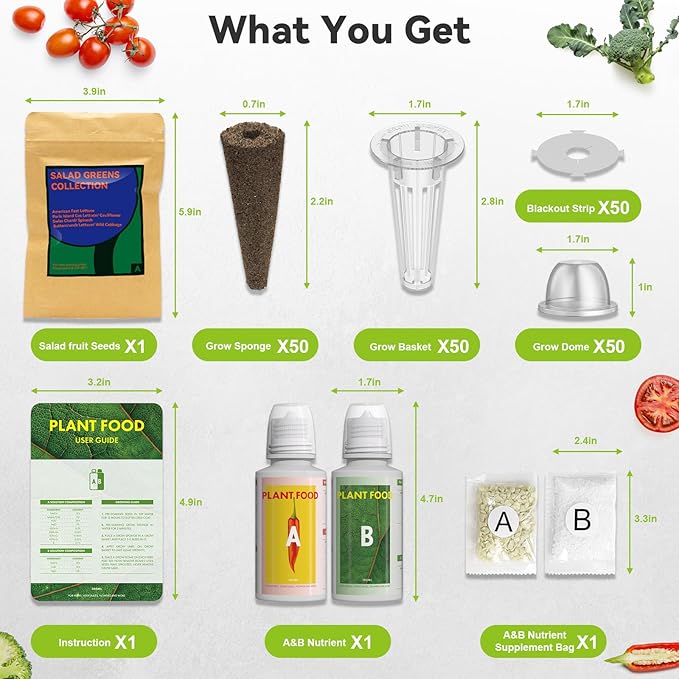 - 【All-IN-ONE Home Garden】These hydroponic pods provide everything you'll need to start your indoor herb garden. 7 types of 350+ organic salad seeds, 50 growing sponges, growing baskets, growing domes and pod labels, 200ml A&B plant food. It's suitable for both beginners and experienced gardeners