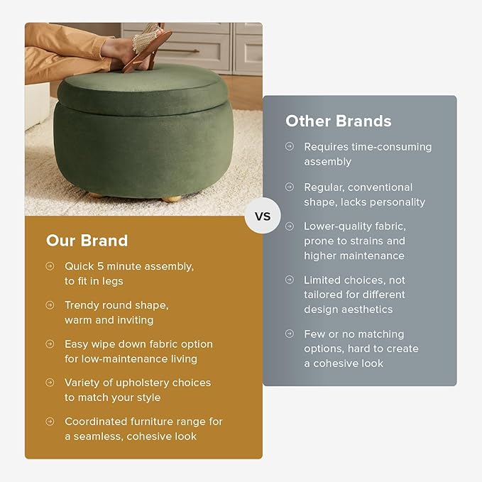 mopio Luna Round Ottoman with Storage and Tray, Round Coffee Table with Storage, Upholstered Foot Stools Ottoman for Living Room, Bedroom, with Solid Rubberwood Legs (Olive Green Premium Velvet)