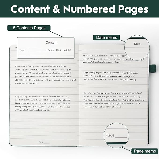 • 【Humanized Design】5 Contents Pages for detailed indexing. No more worrying about not having enough index pages; 1 Exquisite ribbon bookmarks to mark your place effortlessly; 1 Elastic closure band to keep your pages safe; 1 pen holder for convenient storage.; 1 Back Inner pocket for storing notes, receipts, or small items.