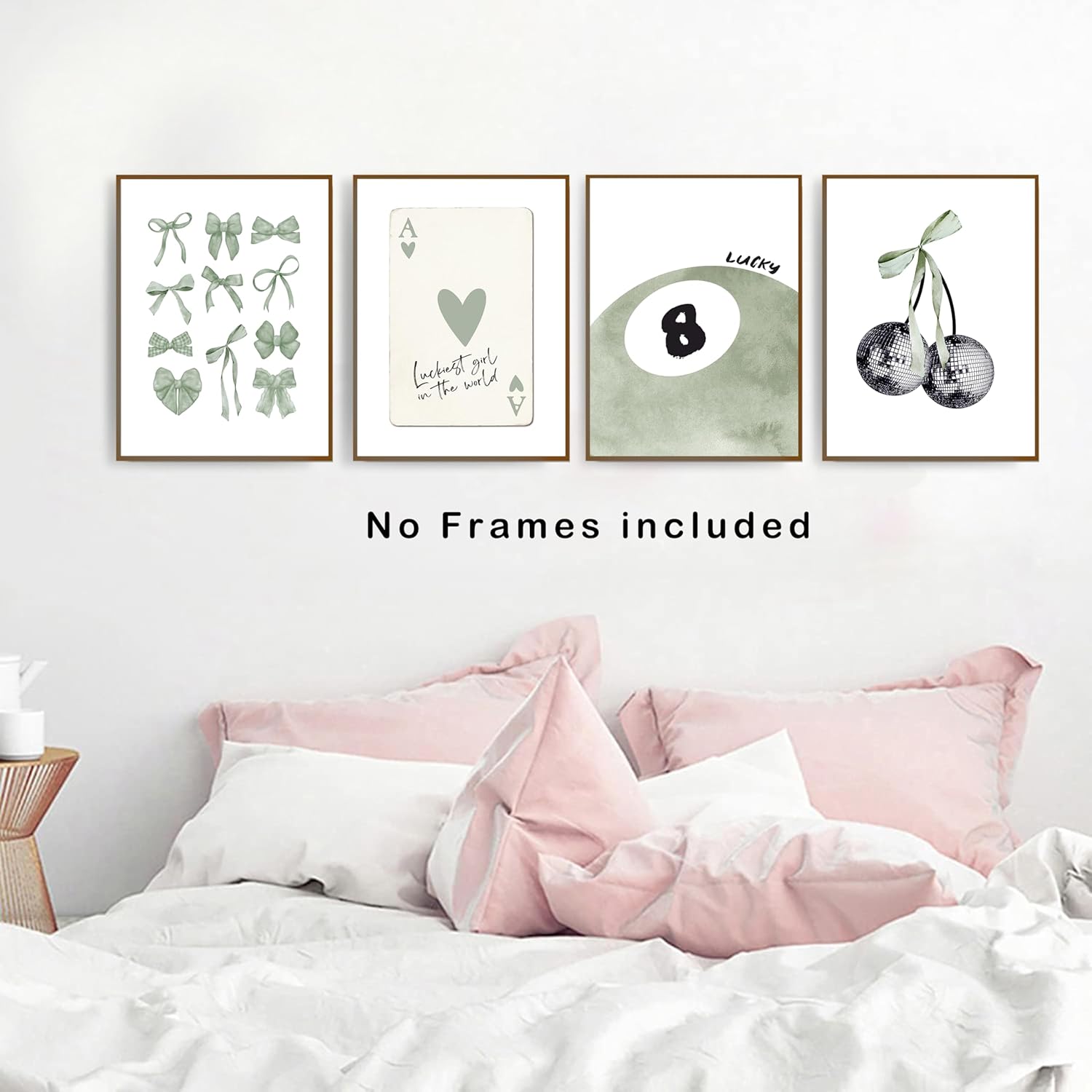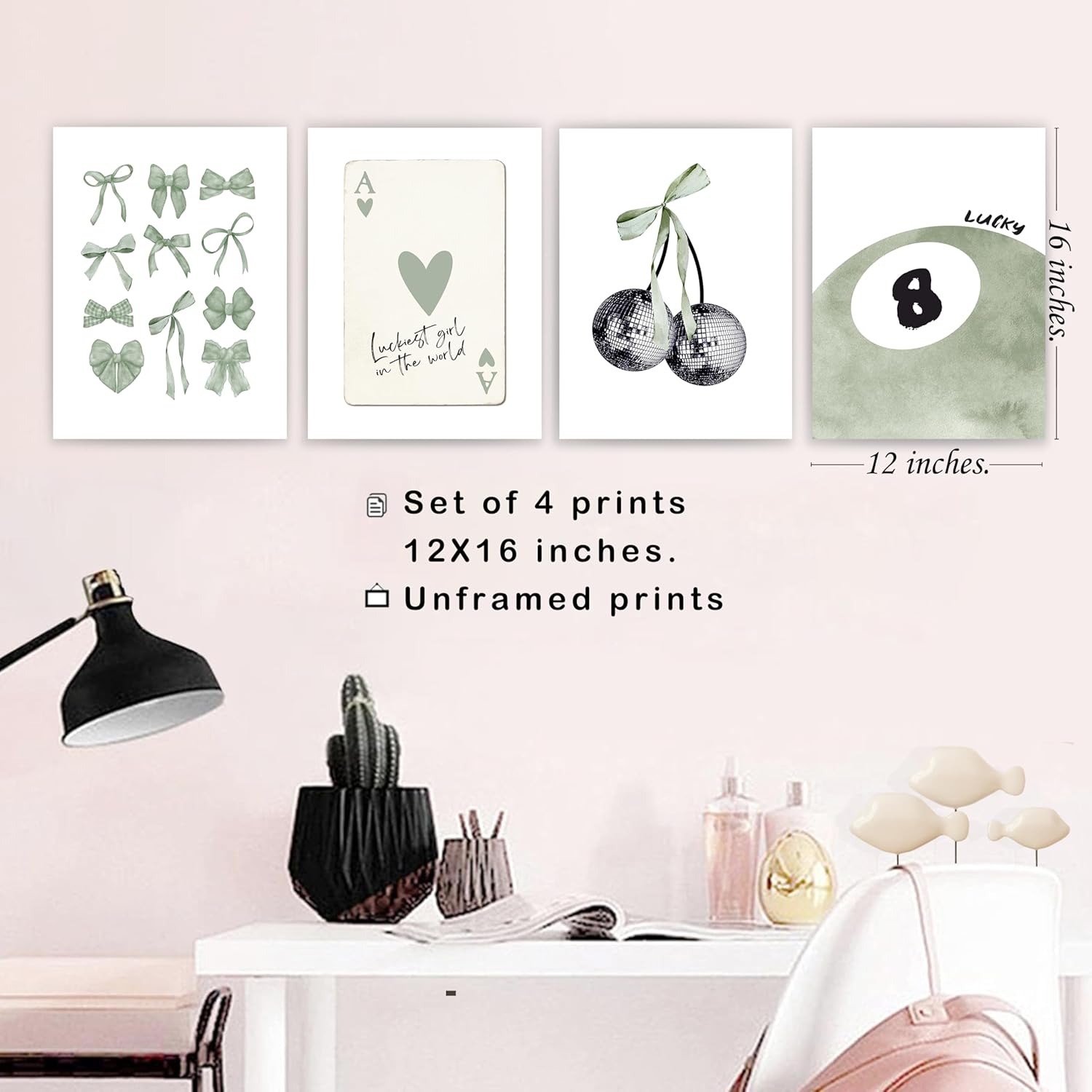 okaxscm Sage Green Coquette Trendy Preppy Wall Art Prints Set of 4, Coquette Preppy Room Decor Aesthetic, Green Bow Disco 8 Ball Cherry Wall Decor Posters for Girls Bedroom Dorm, 12x16 Unframed