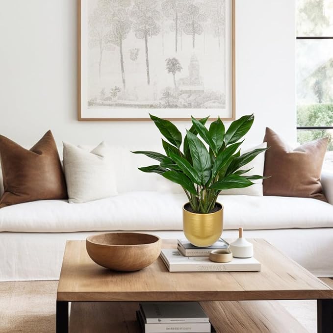 - [High Quality Artificial Plant] -Aspidistra elatior fake plants are made of durable and premium polyester material, safe and easy to clean. Indoor plants artificial is about 16.9 inch tall, and the gold metal pot is 4.7''(diameter) x 4.3''(height). Fake house plants will add a bit of chic design to your living space
