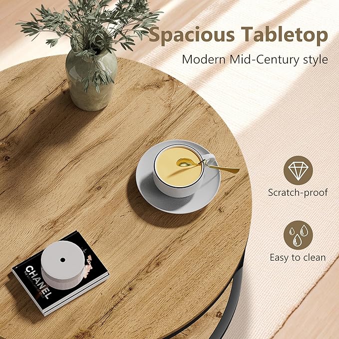 - [Sturdy Wood Coffee Table] The top of our round coffee table is made of MDF material which is Eco-friendly P2 particle board, waterproof and wear-resistant, Multi-step finish process achieves both good looks and superior durability. Thick matte alloy legs sturdy enough to support the coffee table.
