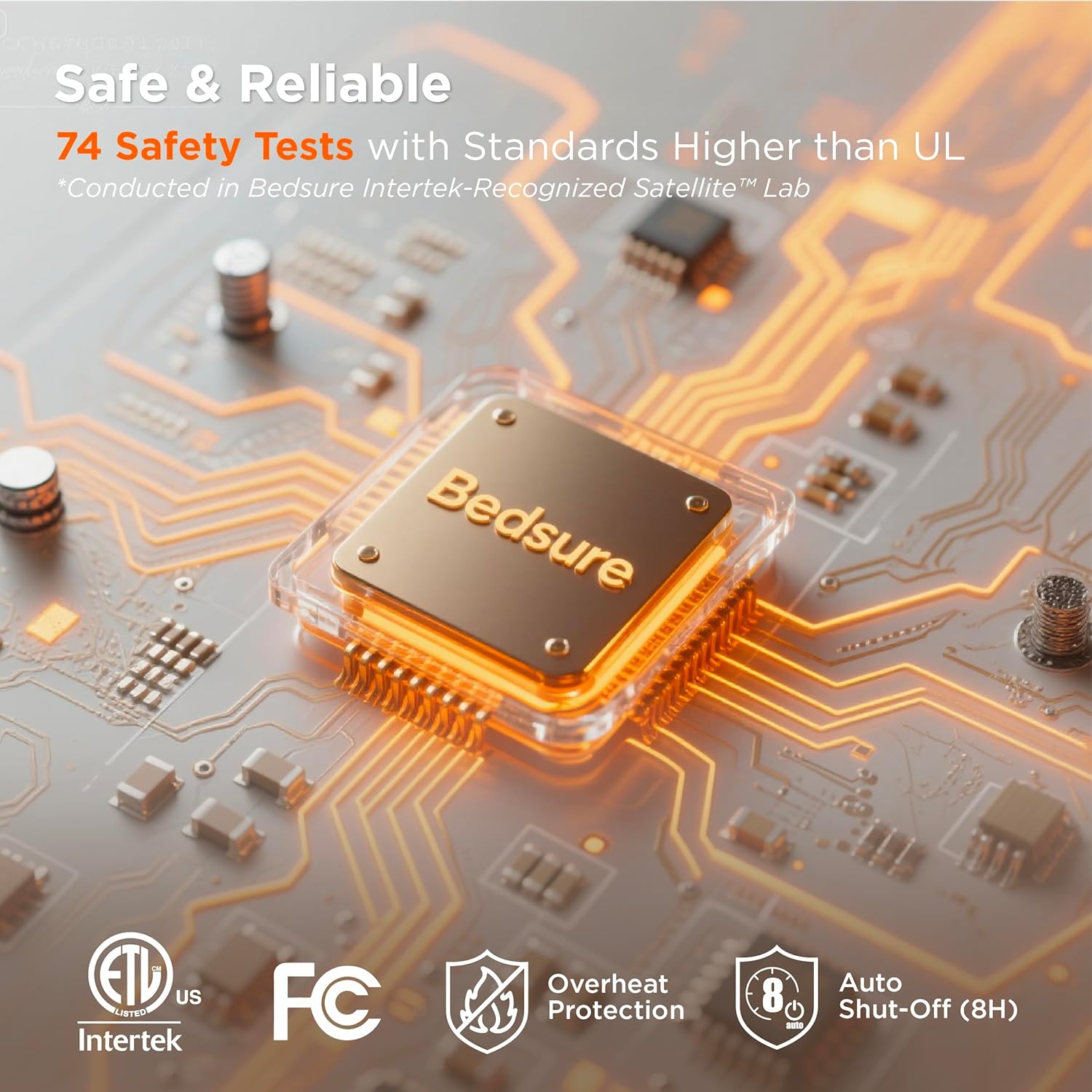 - Safer & More Reliable: Conducted in Bedsure Intertek-Recognized Satellite Lab, 74 safety tests with standards surpassing UL ensure safer performance. This electric blanket twin is ETL and FCC certified, and its default 8-hour auto shut-off prevents it from overheating so that you can enjoy warmth with complete peace of mind