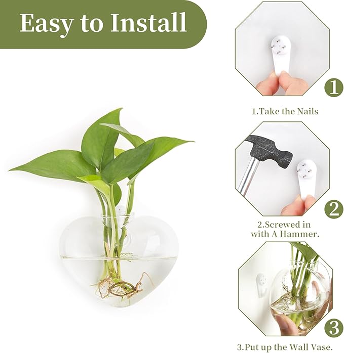 - 🌼Size and Accessories: Each propagation heart vase measures about 5.12 x 4.06 x 2.48 inches/ 13 x 10.3 x 6.3 cm.It's exquisite and small enough to decorate your space.Package included: 2 glass plant containers and 3 nail hooks. Note: Plants and decorations are NOT included!