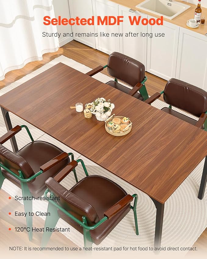 - High-Quality Materials: The tabletop is made of a combination of MDF and laminate finish, which not only gives it an elegant and aesthetic appearance but also provides outstanding functional features. MDF offers a solid, smooth surface base, while the laminate finish enhances the table's resistance to wear, scratches, and stains, effectively protecting our wood dining table from minor scratches and spills