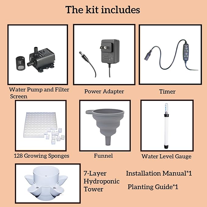 - [The kit includes everything you need. Just open the box and start planting] The Hydroponic Growing System kit includes everything you need: a 7-layer vertical tower, 128 growing sponges, water pump, adjustable timer,water level indicator and a planting guide. Whether you're starting a herb garden or creating a salad station, it’s beginner-friendly and mess-free.(Seeds not included)