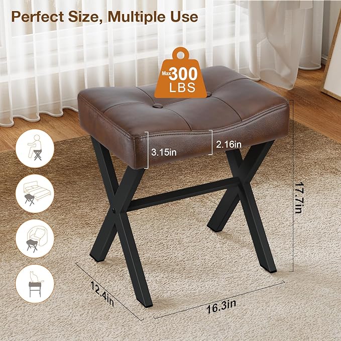 18-Inch Leather Vanity Stool Chair, Vanity Bench with Metal X-Leg, Ottoman Accent Stool with Thick Padded Saddle Seat, Dark Brown