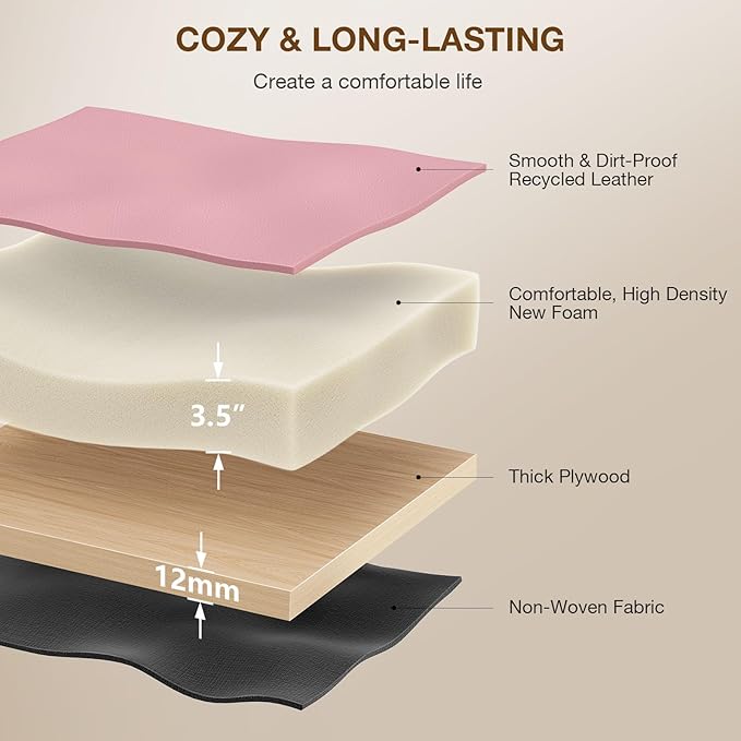 - 【Elegant Saddle Stool】The Memobarco makeup stool features premium 3mm synthetic leather upholstery for easy cleaning, with a 3.5-inch high-resilience foam cushion that delivers ergonomic comfort, and all-day relaxation.
