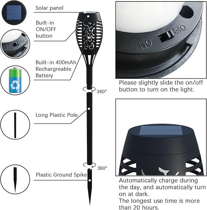 - 🔥【Auto Charge & Auto Light Up】: Solar tiki torches for outside automatically collect solar energy all day in direct sunlight and turn it into electricity to continuously charge the battery and include a photosensitive control switch on its solar panel, From dusk to dawn (no sunlight), the lights are automatically turned on, and when the sun rises (the solar panel receives sunlight) the lights will automatically turn off and charge automatically. Convenient and practical.