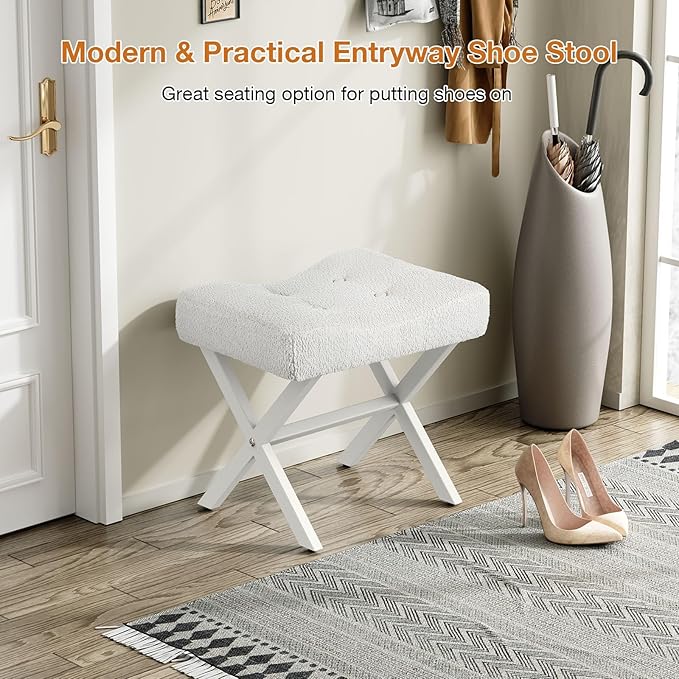 18-Inch Large Vanity Stool Chair, Vanity Bench with Metal X-Legs, Ottoman Accent Stool with Breathable and Soft Boucle Fabric Saddle Seat, White