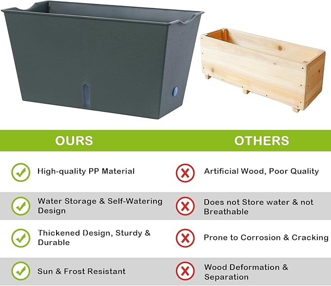 - 【Premium & Durable】This self-watering planter pot has a marble frosted design, which is very textured and it uses high-quality PP material to provide an all-round growing environment for plants, keep your plants growing healthily. This window box planter is sturdy, wear-resistant and durable. It can be exposed to light, wind, and sunlight for long periods of time, with a lifespan of decades. It is an excellent planter box for both indoor and outdoor.