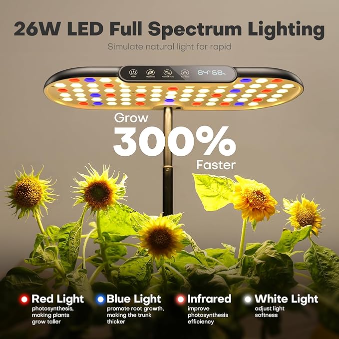 - 17.3in adjustable full-spectrum Led grow liht: indoor growing system with 2 smart modes and automatic day/night switching protects tall plants from light burn by extending the grow lamp to 17.3 inches; professional LED Grow Lights mimic natural light with 16-hour on/8-hour off, and a one-button "Vegetable Mode" (optimized for greens) and “Fruits Mode” (for fruits/flowers) increase plant growth by up to 30% with spectral adjustments. Advanced Indoor Hydroponics.