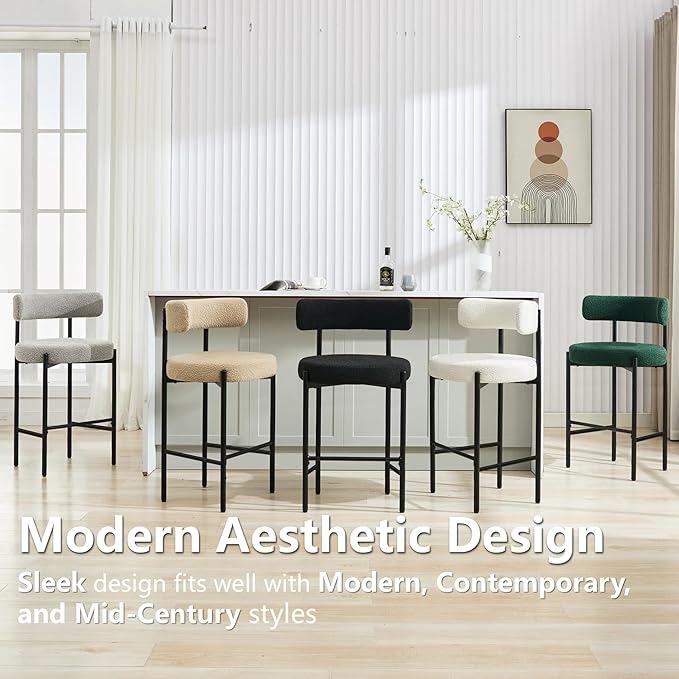 - 【Modern Aesthetic】Enhance your space with these counter height bar stools, featuring a sleek curved back, textured boucle fabric, and a rounded seat. Available in 4 stunning colors—white, black, grey, beige—and paired with your choice of black or gold legs, they blend classic charm with modern elegance. Perfect for kitchen islands, counters, or dining areas