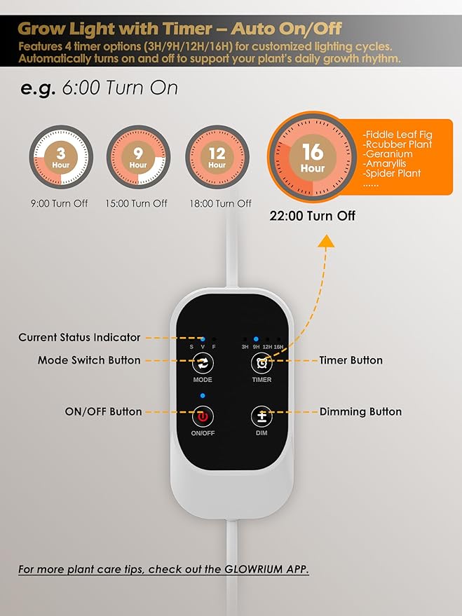 - 【Smart Timer Settings (3H/9H/12H/16H)】 Built-in timer offers 4 automatic lighting cycles. Simply set your preferred schedule, and the light will turn on and off automatically—perfect for maintaining plant care at home or while away.