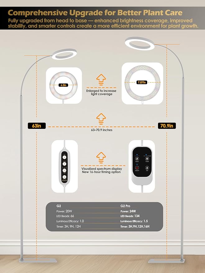 - 【Adjustable Height & Enlarged Lamp Head】 Upgraded 4-section pole extends up to 70.9 inches, ideal for plants of various heights. The enlarged lamp head and 360° flexible gooseneck allow broader light coverage and precise angle adjustments, ensuring efficient and customized lighting.
