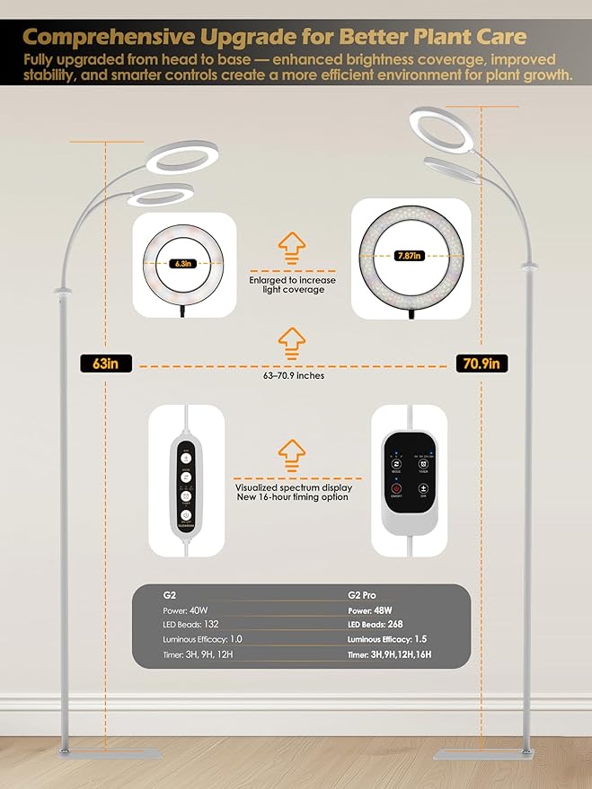 - 【Adjustable Height & Enlarged Lamp Head】 Upgraded 4-section pole extends up to 70.9 inches, ideal for plants of various heights. The enlarged lamp head and 360° flexible gooseneck allow broader light coverage and precise angle adjustments, ensuring efficient and customized lighting.