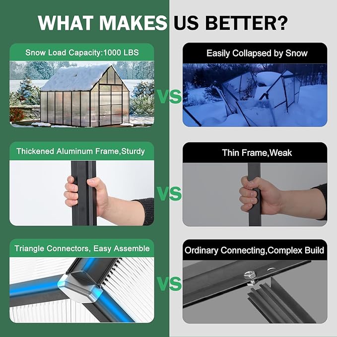 - 【Enhanced Aluminum Frame】Our premium polycarbonate greenhouse features a robust yet lightweight black aluminum structure, reinforced for better durability. The frame is secured with corrosion-resistant stainless steel fasteners, ensuring extended longevity and enhanced resilience against extreme weather elements.