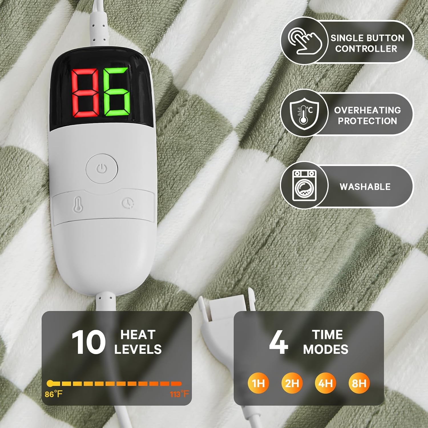 - CUSTOMIZABLE COMFORT: The single-button controller for this throw blanket for couch has LCD display. Select from 10 heat levels (up to 113°F),higher than the rechargeable heated blanket,can combat frosty mornings, chilly evenings, or varying seasonal needs. Four timer settings let you program warmth for naps, movie nights, or all night use—no more waking up to adjust settings. Whether you need gentle warmth for relaxation or higher heat for muscle relief, it adapts seamlessly to your lifestyle.