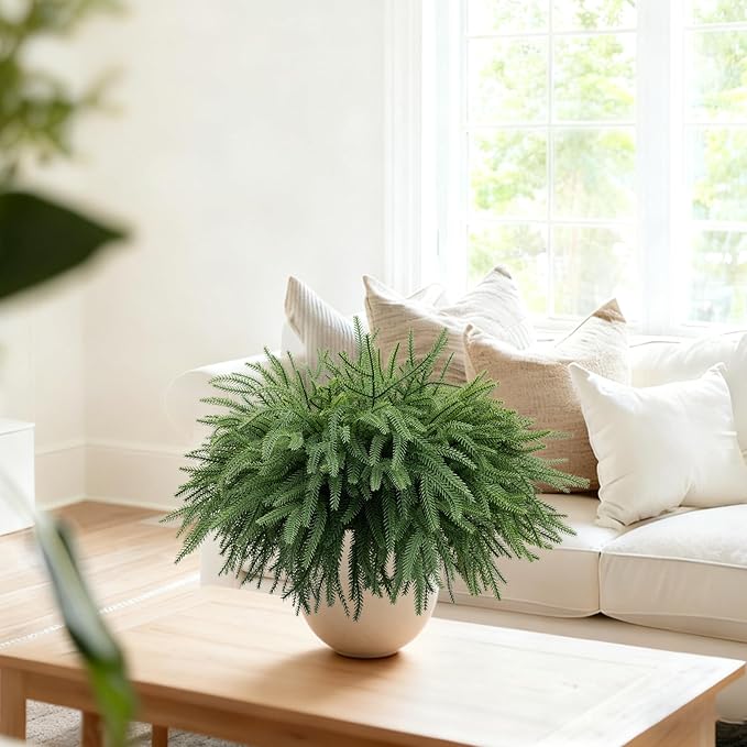 - [Holiday Decor]: These artificial norfolk pine branches are not only perfect for various Christmas-themed decorations, such as dining table arrangements, corner decorations, fireplace decor, kitchens, bedrooms, living rooms, windows, and door decorations, but they can also be used to create Christmas wreaths, garlands, tree decorations, and centerpiece arrangements. These realistic touch Norfolk pine branches will add a warm and festive atmosphere to your home.