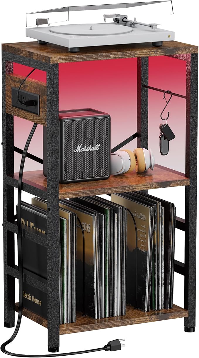 End Table with LED Light,Record Player Stand with Charging Station,Vinyl Records Storage,Turntable Stand Albums Storage for Music Room Studio-Modern Brown