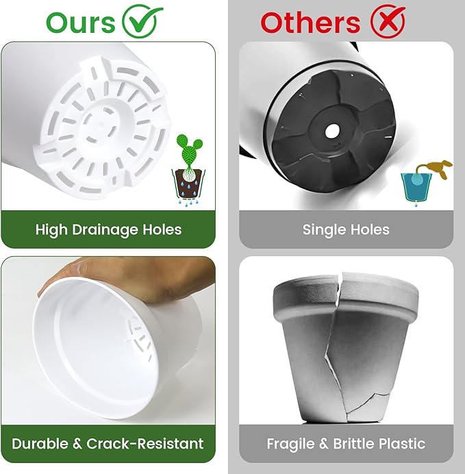 - [Drainage System Designed for Healthy Roots] These 6 inch plant pots feature multiple drainage holes at the bottom to promote airflow and prevent waterlogging. Matching saucers help catch excess water and reduce mess, making them ideal plant pots with drainage for both indoor and outdoor use.
